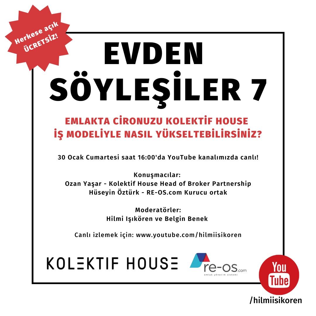 30 Ocak Cumartesi 16:00'da, Kolektif House'dan Ozan Yaşar ile birlikte, Hilmi Işıkören ve Belgin Benek'in konuğu olacağız. Hazır ve paylaşımlı ofis sistemlerinin dünyada gelişim alanları, Covid'19 sonrası dönemde yeni iş ortamlarının ve çalışma modellerinin işletmelere ve çalışanlarına neler vaad ettiği, sektörel işbirliği kazanç sistemleri konuşulacak. Soru & Cevap bölümü de olacak şekilde, doyurucu bir içerik ve paylaşım olması hedefleniyor. Konuyla ilgili herkesi bekleriz.